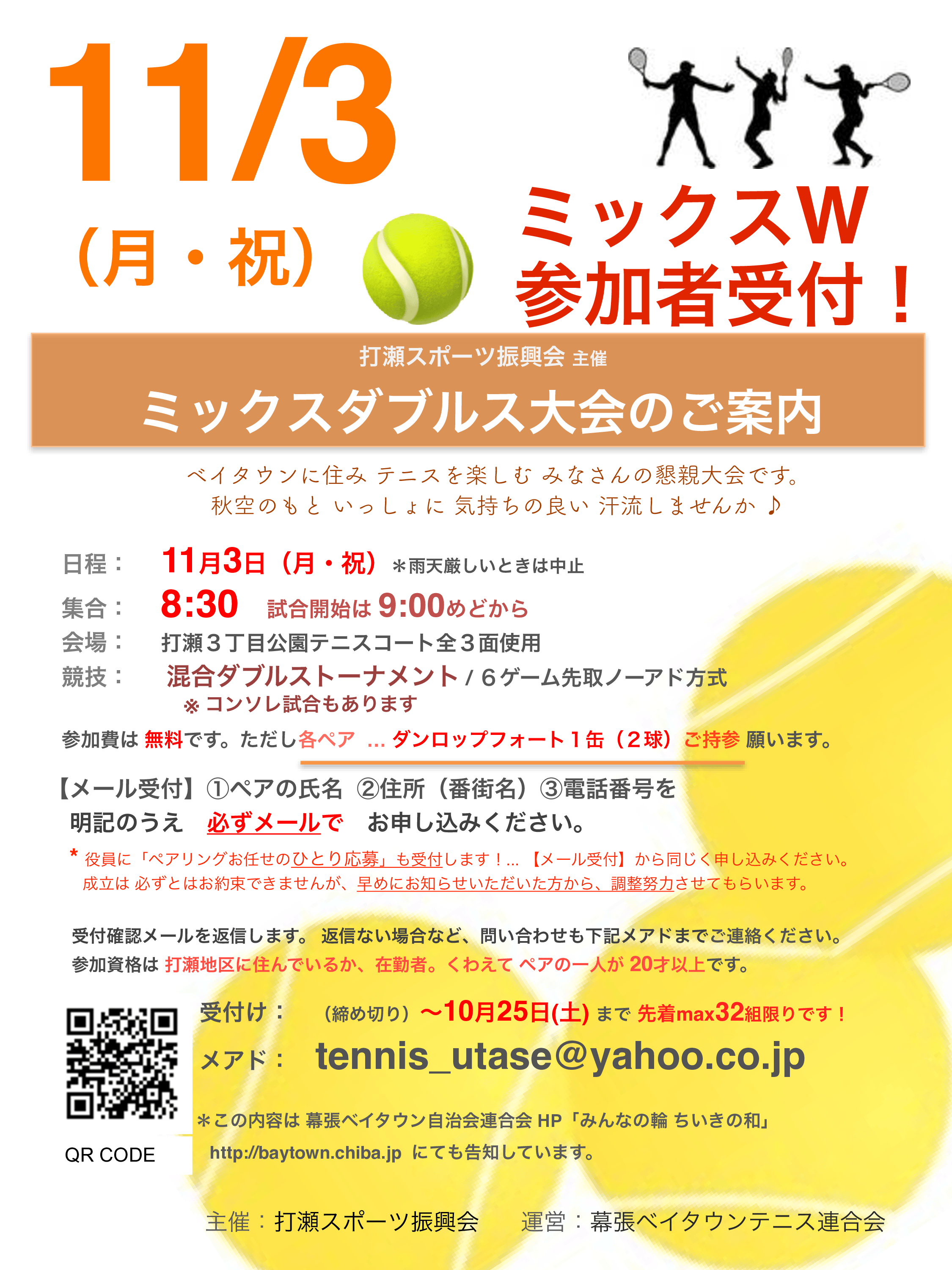 打瀬スポーツ振興会が主催するミックスダブルス大会が開催されます。詳細は下記ポスターを参照願います。